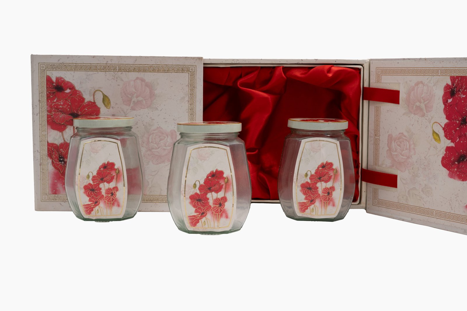 Red Poppy Floral Storage Box with Glass Jars – 3-Piece Decorative Organizer Set